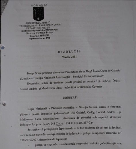 RISE Project a descoperit că DNA Brașov a dispus în 2011 neînceperea urmăririi penale față de cei trei judecători: Gabriel Uță, Ordog Lorand Andras și Lidia Moldovanu. Procurorul de caz a motivat atunci că nu există niciun indiciu din care să reiasă că judecătorii nu au dat dovadă de imparțialitate sau că ar fi fost implicați în acte de corupție.