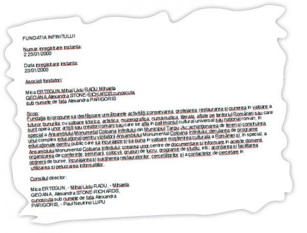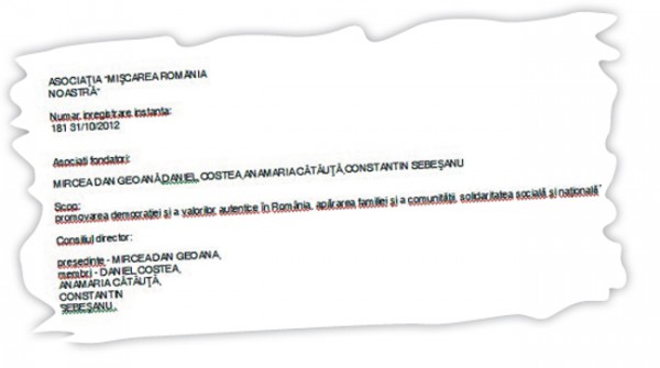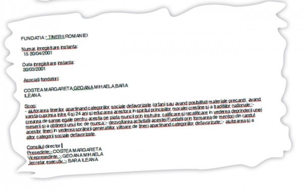 Astfel, in aprilie 2001, deja la varsta de 65 de ani, soacra lui Geoana, Margareta Costea, infiinta Fundatia Tinerii Romaniei, un ONG dedicat sprijinirii celor cu varste cuprinse intre 6 si 24 de ani. Functiile in cadrul ONG-ului s-au impartit in familie. Margareta Costea si-a atribuit statutul de presedinte, iar fiica – Mihaela Geoana- functia de vicepresedinte. Desi avea ambitii mari, si anume de a educa tinerii “in spiritul principiilor moralei crestine si a traditiilor nationale” si de a forma “mentori din randul acestor tineri in vederea sprijinirii generatiilor viitoare de tineri…”, doamna Costea nu a derulat prin acest ONG mari proiecte care sa fie, cu adevarat, de folos. A rulat insa suficiente donatii astfel incat Fundatia Tinerii Romaniei sa raporteze in bilanturile contabile ca detine active circulante in valoare de peste 233.000 lei, adica in jur de 50.000 de euro. Cum ONG-urile sunt mai putin transparente, in cele mai multe cazuri, decat societatile comerciale, nu putem spune cu certitudine in ce constau activele de peste 50.000 de euro administrate de Margareta Costea.