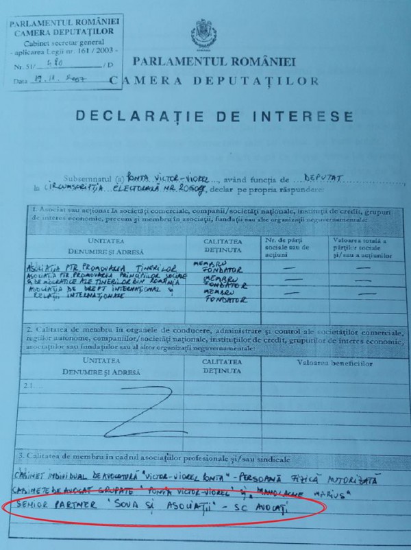 Victor Ponta a scris, sub semnătură, în Declarația de Interese din 19.11.2007, înregistrată la Camera Deputaților cu nr. 51/480/D, că este Senior partner la “Șova și Asociații”.