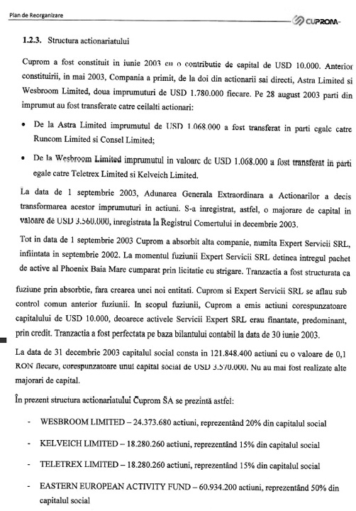 Cuprom SA, firma infiintata in 2003 special pentru a prelua laolalta combinatele de la Baia Mare si Zalau, a avut de la bun inceput actionariat 100% cipriot. Wesbroom Limited, Astra Consultancy Limited, Kelveich Limited, Teletrex Limited, Consel Consultancy Limited si Runcom Limited sunt firmele actionare pe banii carora, teoretic, s-au cumparat combinatele de la Baia Mare si Zalau. Evident, insa, desi infiintate in Cipru, toate aceste firme au avut legaturi directe cu Horia Schiopu-Simu si Horia Pitulea. Asa cum vom arata in urmatoarele articole, circuitele financiare dezvoltate prin Cipru si Insulele Virgine l-au ajutat pe Simu sa isi transfere in aceste locatii milioane de euro, in timp ce in Romania au fost lasate datorii de zeci de milioane de euro.