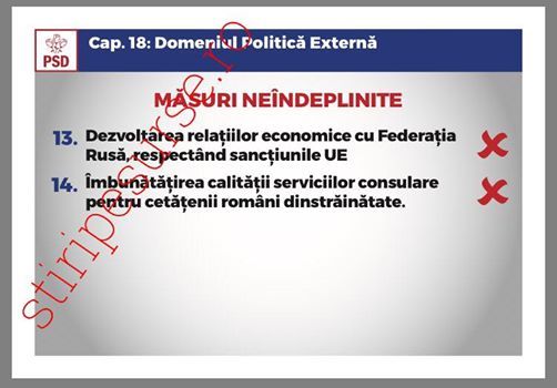 În presă au apărut miercuri după-amiază informații din raportul de evaluare a Cabinetului Grindeanu, în care, la domeniul politică externă, este menționată ca măsură neîndeplinită „dezvoltarea relațiilor economice cu Federația Rusă, respectând sancțiunile UE”.