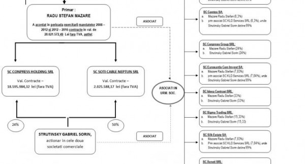 Totodată, potrivit informațiilor analizate de ANI în baza datelor existente la Oficiului Național al Registrului Comerțului, “Radu Ștefan Mazăre și Strutinsky Sorin Gabriel au fost identificați ca fiind asociați persoane fizice sau prin intermediul persoanelor juridice din care fac parte în următoarele societăți comerciale”: SC Alliance Qwest Company SA, SC Comtex SA, SC Conpress Group SRL, SC Eurosantis Com Invest SA, SC Ideea Contrast SRL, SC Sigma Trading SRL, SC Silk Estate SA şi SC Xenoti SRL.