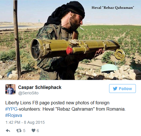 „Leii Libertatii au postat pe pagina lor de Facebook noi fotografii cu voluntarii #YPG: Heval ‘Rebaz Qahraman’ din Romania. #Rojava”, a scris pe Twitter Caspar Schliephack.