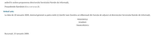 La data de 20 ianuarie 2009, domnul general cu patru stele (r) Zamfir Ioan Dumitru se eliberează din funcţia de adjunct al directorului Serviciului Român de Informaţii.
