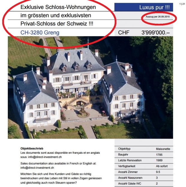 Potrivit sursei citate, Castelul Greng, întins practic pe trei domenii impozante și foarte aproape de malul lacului Murten, are 1,3 hectare de parc, 19 camere separate într-o multitudine de corpuri de clădire, 690 de mp locuibili, fântâni ornamentale, labirint, templu în stil roman, capelă, piscine, iaz cu pești, are sursă proprie de apă, tavernă proprie și cramă, plajă privată pe malul lacului iar întregul domeniu al castelului este împrejmuit de ziduri înalte și opace fiind ferit din exterior de blitzurile de paparazzi.