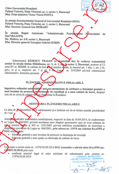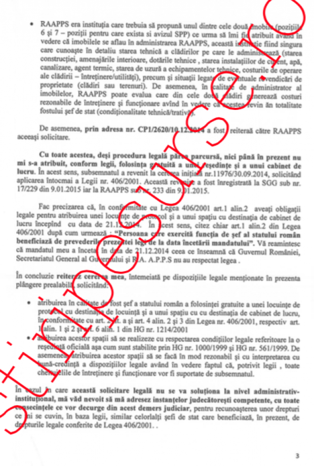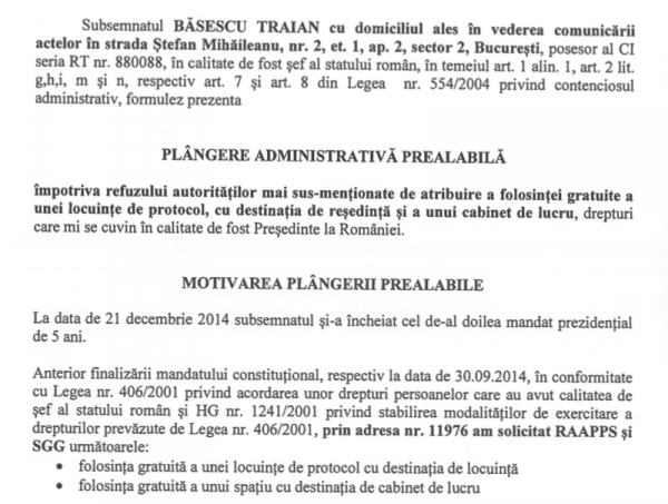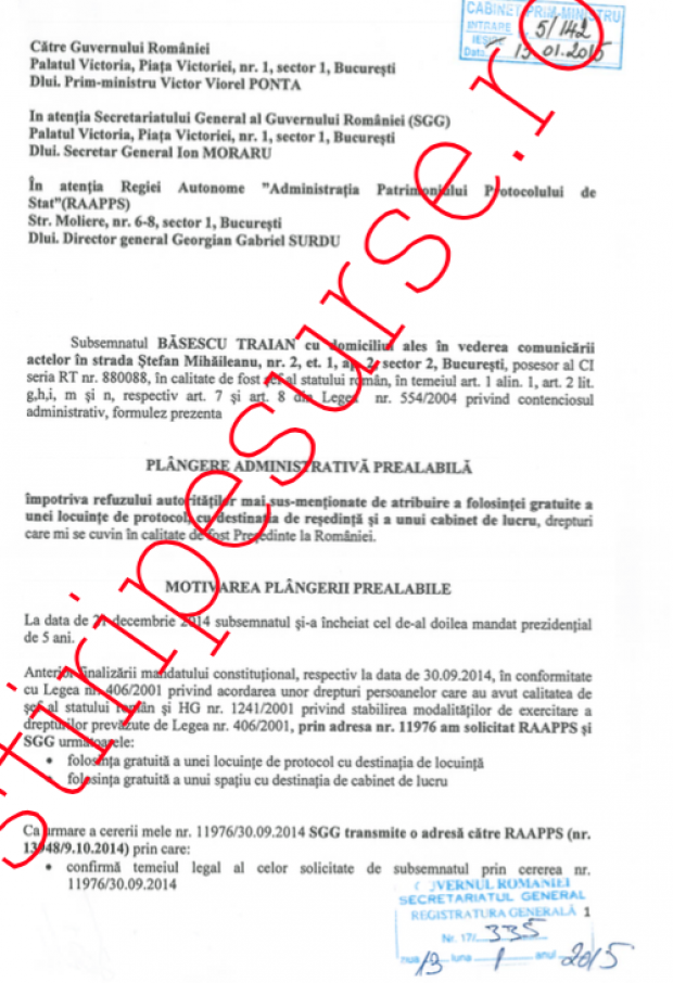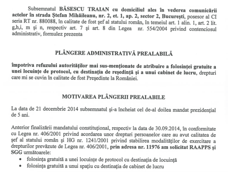 Fostul președinte Traian Băsescu a notificat Guvernul României că l-a acționat în judecată pentru neatribuirea unui imobil pentru folosința sa ca fost președinte al Romaniei, transmit în exclusivitate jurnaliștii de la stiripesurse.ro.