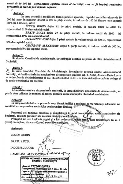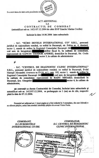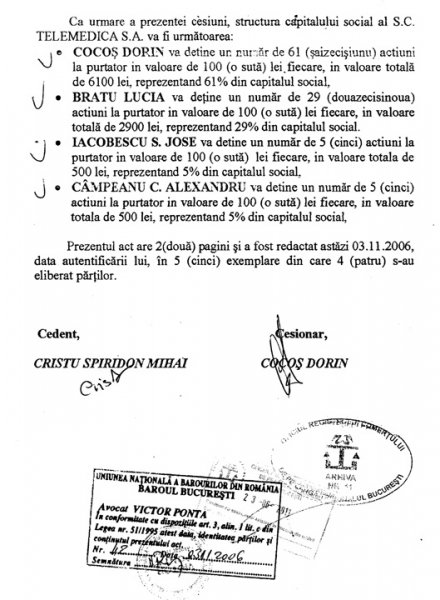 Practic, dupa termenul uzual folosit in mediul avocatesc, Victor Ponta era „baiatul de mingi” al lui Dorin Cocos, si asta pe o perioada intinsa pe mai multi ani de zile. Iar marile „cazuri” rezolvate de avocatul Victor Ponta, in schimbul unor sume importante de bani, erau potrivite mai degraba pentru un stagiar flamand. Ne vom limita insa ca in numarul de astazi sa dam doar cateva exemple de astfel de „dosare” care poarta, pe aceeasi pagina, semnaturile lui Dorin Cocos si ale lui Victor Ponta. Este vorba despre „Actul aditional la actele constitutive ale S.C. TELEMEDICA S.A.” , „Actul aditional la contractul de comodat dintre S.C. EURO HOTELS INTERNATIONAL CO SRL si S.C. Centrul de Diagnostic Clinic International SRL”, „ Contractul de cesiune actiuni ale S.C. TELEMEDICA SRL”, „Actul aditional la actele constitutive ale Centrului de Diagnostic Clinic International SRL” si lista ar putea continua la nesfarsit. Plus tot felul de incheieri de atestare si declaratii pe propria raspundere date de Dorin Cocos in fata avocatului platit Victor Ponta.