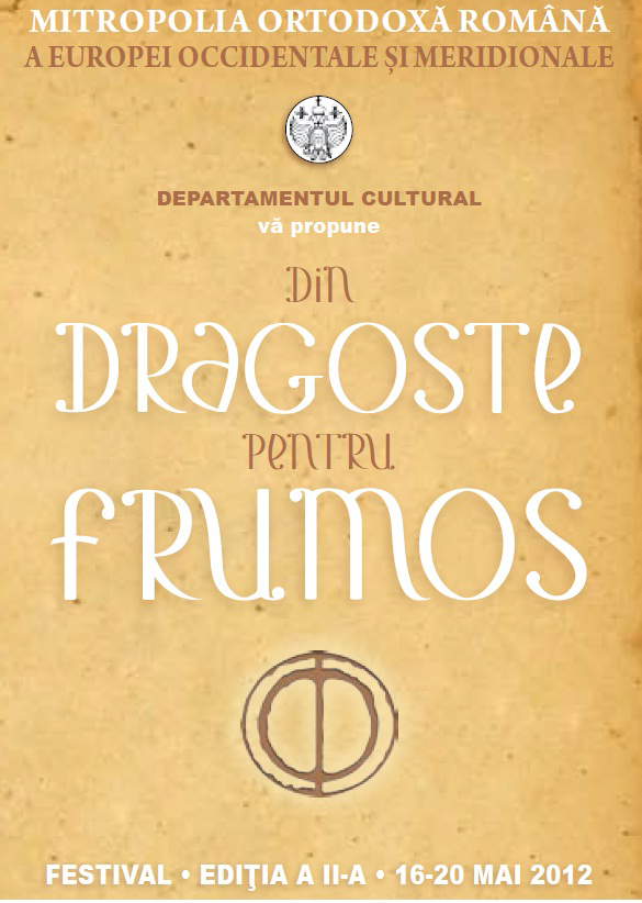 Mitropolia Ortodoxa Romana a Europei Occidentale si Meridionale organizeaza, in perioada 16-20 mai 2012, cea de-a doua editie a Festivalului de arta, cultura si teologie “Din dragoste pentru frumos”.