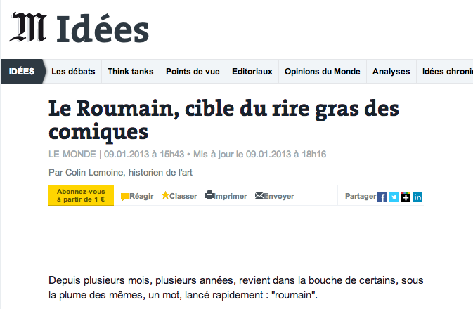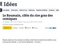 Reamintind de afirmaţiile recurente despre români de la televiziune făcute de unii comici francezi, precum Jamel Debbouze şi Jonathan Lambert, eseistul scrie că românul a devenit ‘noua oaie neagră’ sau ‘ţapul ispăşitor’.