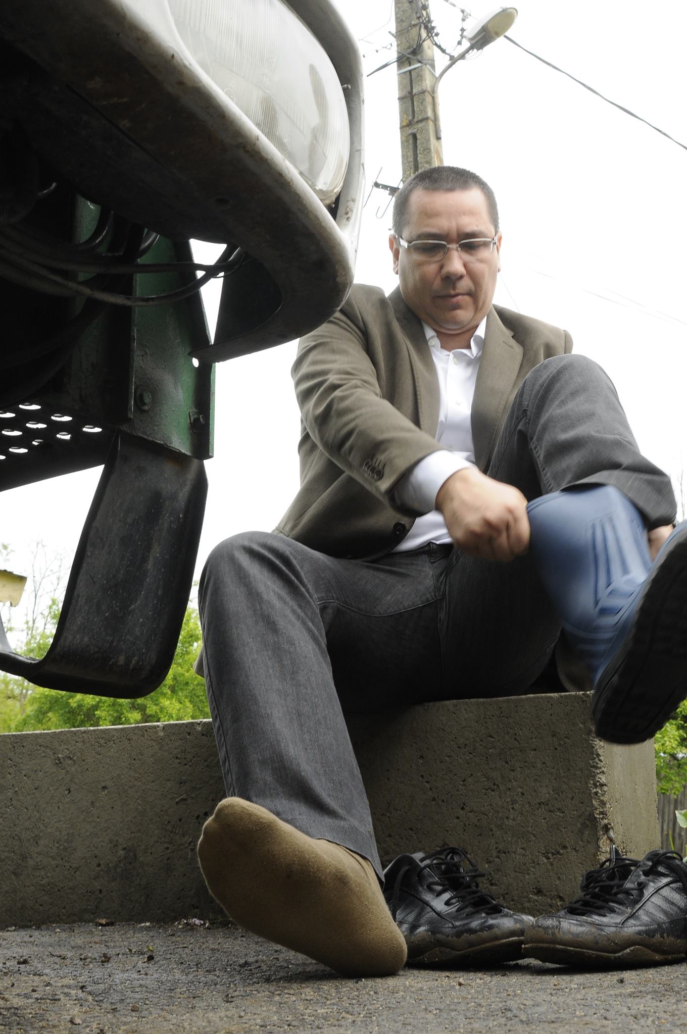 Un fotograf sau fotoreporter (care pentru poza asta ar fi luat în Statele Unite ale Americii Premiul Pulizer şi s-ar fi umplut rapid de bani) l-a prins pe Ponta descălţat de pantofii sport, punându-şi cizmele, ca să meargă la inundaţii, în plin efort, cu două rânduri de bărbii atârnându-i sub făţăul tot mai gras. Mircea Marian a publicat poza pe contul lui de Facebook.