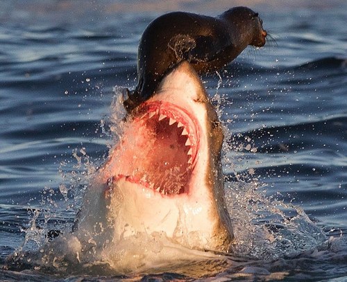 Daily Mail a publicat o fotografie incredibila, surprinsa in Africa de Sud de fotograful Chris Fallows. Un grup de turisti aflati in False Bay, printre care si Fallows, au fost martorii unei scene ingrozitoare, cand un rechin a iesit brusc din apa si a incercat sa prinda o foca.