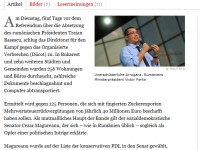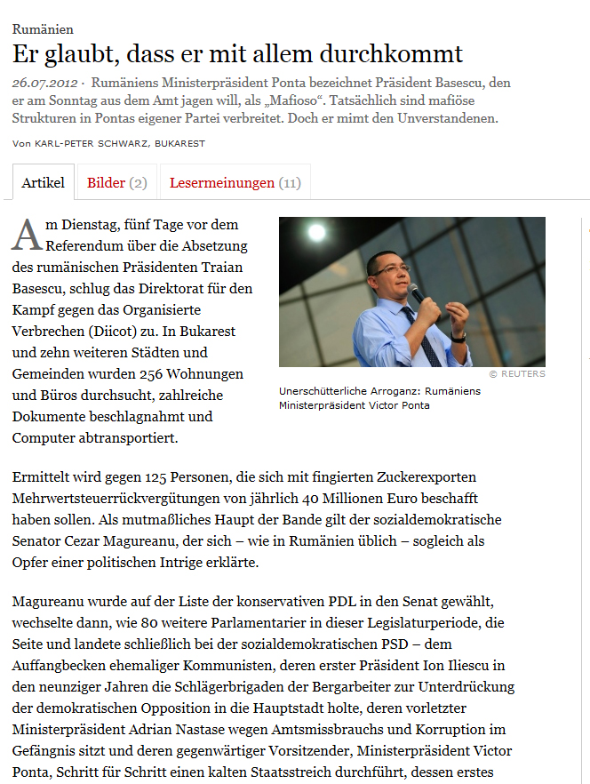 Premierul Romaniei, Victor Ponta, il numeste pe presedintele Basescu, pe care vrea sa-l demita duminica din functie, un mafiot. Realitatea e ca structuri mafiote se gasesc in propriul partid al lui Ponta. Cu toate acestea, premierul face pe neintelesul, scrie Frankfurter Allgemeine Zeitung, intr-un articol semnat de Karl-Peter Schwarz, scrie Hotnews.