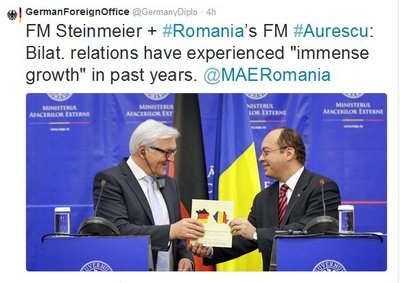 La finalul interventiei sale din conferinta comuna de presa cu omologul german, ministrul de Externe, Bogdan Aurescu, a prezentat o brosura realizata cu ocazia aniversarii a 135 de ani de relatii diplomatice intre Romania si Germania.