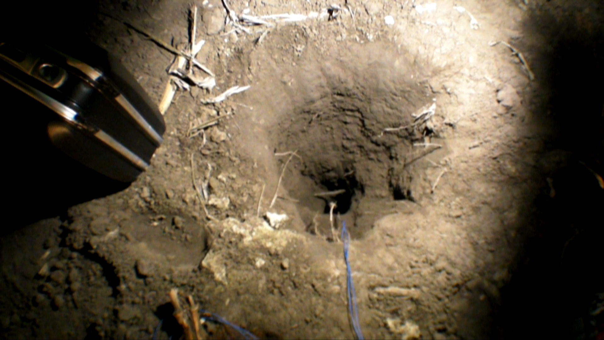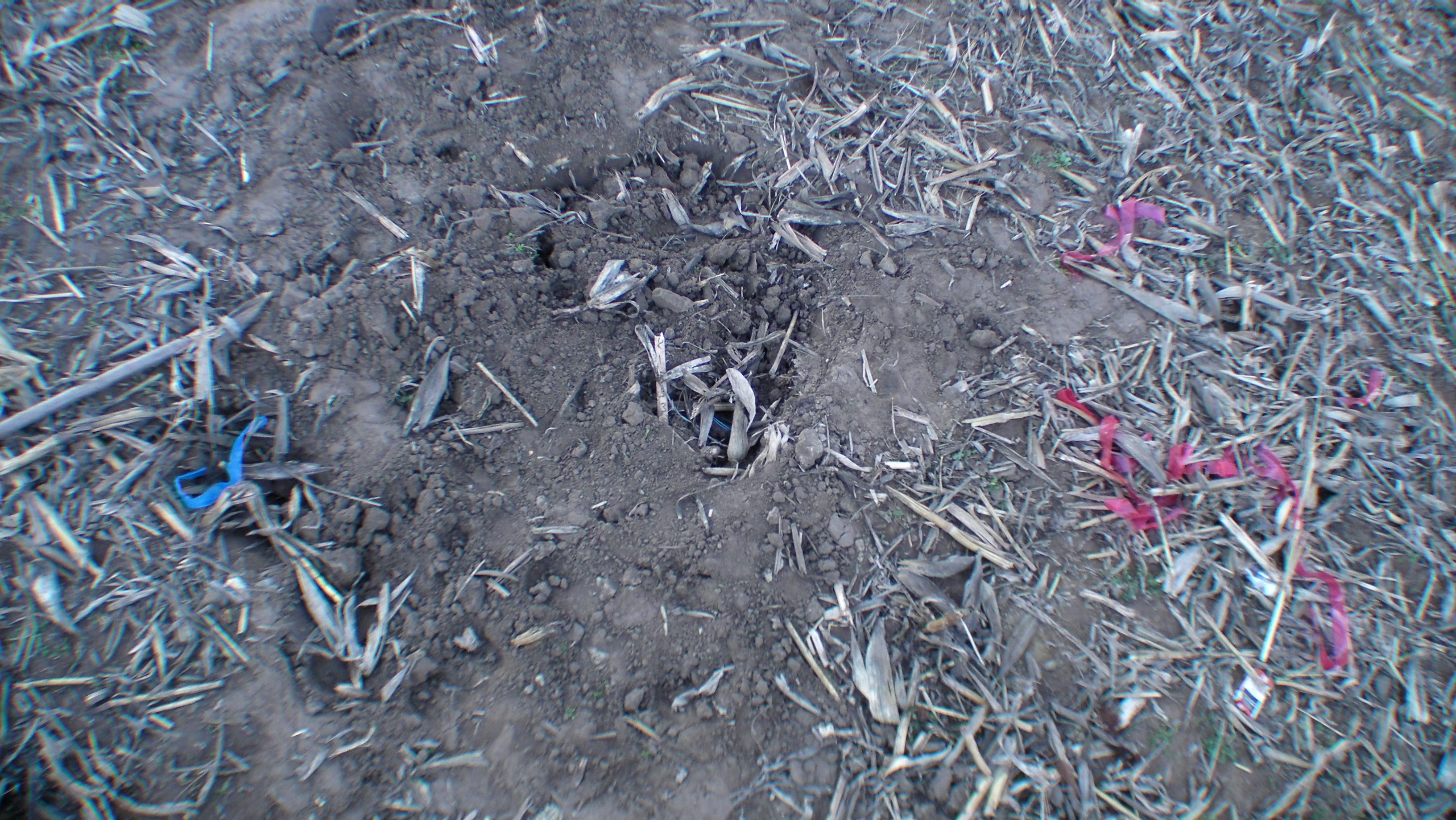 La prima vedere pare doar o tarla de porumb neingrijita. Un artificier experimentat observa insa cu usurinta ca este vorba de o gaura de sonda nedetonata…