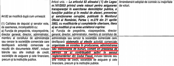 Altfel spus, prin amendamentul adoptat de comisia juridică, senatorii şi deputaţii sunt liberi să facă parte din conducerea unei societăţi comerciale cu o activitate ocazională şi, prin urmare, scapă de incompatibilitate.