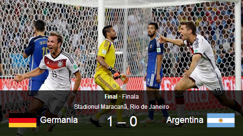 Screenshot_5Reprezentativa Germaniei a câştigat Cupa Mondială pentru a patra oară în istorie, în urma victoriei de duminică, de pe arena Maracana din Rio de Janeiro, obţinută după prelungiri, scor 1-0, în faţa selecţionatei Argentinei.