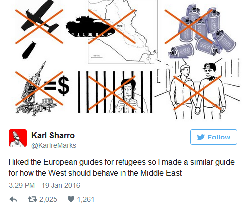 tweet2Ilustratiile lui Sharro, publicate pe Twitter, sugereaza ca ar fi bine ca fortele coalitiei sa evite pe cat posibil atacurile aeriene si invadarea altor state, precum si folosirea gazelor lacrimogene sau a armelor de ucidere in masa in Orientul Mijlociu.