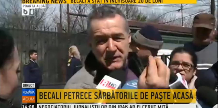 Gigi Becali a fost eliberat condiționat vineri la 14.05 , conform deciziei definitive dată vineri instanța de Tribunalul Constanța. La ieșire și-a cerut scuze jurnaliștilor pe care i-a înjurat, dar și fostului președinte Traian Băsescu. Eu atacam președintele țării, nu trebuia să fac, a spus Gigi Becali la ieșirea de la Poartă Albă. Vreau să mă ierte toată lumea, vreau să mărturisesc pe Christos, a susținut Becali.