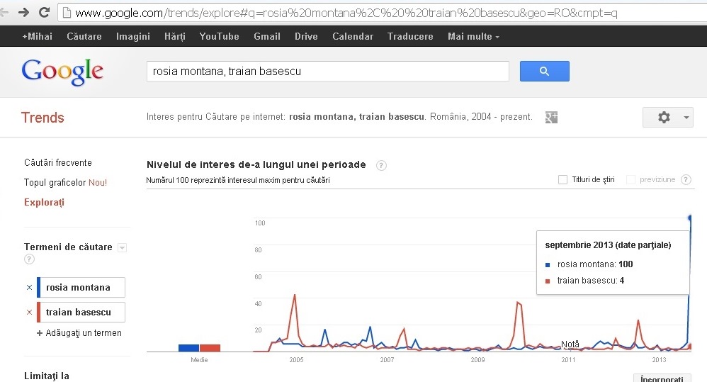 Spre comparație (vezi graficele), căutările cu termenii ”Victor Ponta” au atins în luna septembrie nivelul de interes 2, iar cele cu ”Traian Basescu”, 4. Cel mai ridicat nivel de interes pentru ”Victor Ponta” a fost 19 (în iulie 2012), iar pentru ”Traian Basescu” 43 (în decembrie 2004), 37 (în noiembrie 2009) și 24 (în iulie 2012). Chiar și în campaniile electorale (din 2004 și 2009) și pe perioada suspendării (2012) nivelul de interes pentru ”Traian Basescu” a fost la mai puțin de jumătate față de interesul pentru subiectul Roșia Montană (iar diferența e posibil să fie, de fapt, mult, mult mai mare 100 fiind nivelul de interes maxim monitorizat – adică ce ar fi ”peste 100”, tot ca 100 apare).