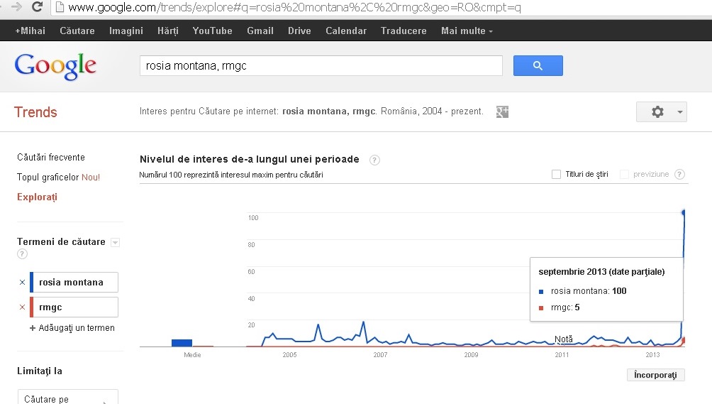 O comparație (pentru a vedea cât de ”eficientă” e propaganda RMGC în mediul online). În ciuda reclamelor masive (inclusiv în mediul online) nivelul de interes a reușit să ajungă, în septembrie 2013, doar până la 5.