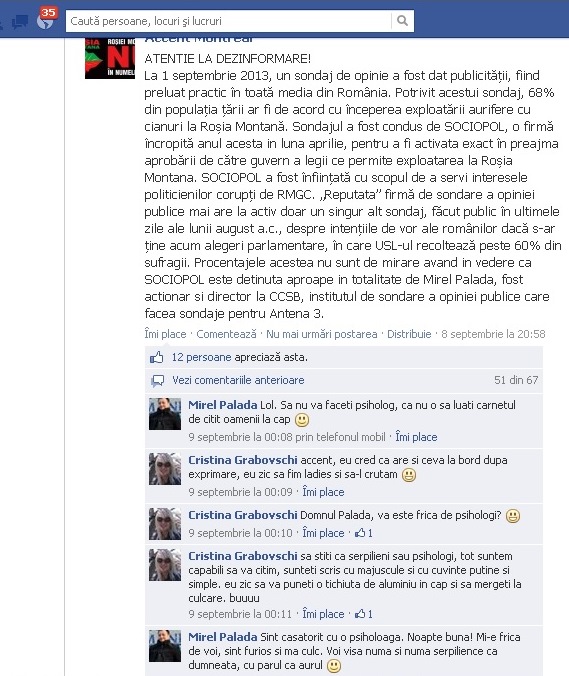 Și pentru că tot e vorba de online, Facebook, Roșia Montană și diferite manipulări. Unii cunosc așa-zisul sondaj de opinie lansat de Sociopol pe piață chiar în preziua începerii protestelor. Cel cu ”2 din 3 români e de acord cu proiectul de la Roșia Montană” (nu mai insist asupra tâmpeniilor din sondaj, a întrebărilor și interpretărilor ”din pix” (o analiză sociologică detaliată puteți citi aici). Unii au mai aflat și că la doar două zile după livrarea acestei comenzi, Mirel Palada, patronul Sociopol, a fost recompensat cu un loc lângă Ionel Blănculescu și Wesley Clarck, ca și consilier de stat al lui Victor Ponta.
