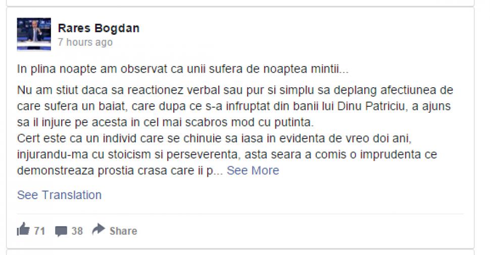 „Informația publicată de mine l-a urzicat rău pe Rareș Bogdan. Iar acesta a produs un text mizerabil, de care ar trebui să-i fie rușine. Poate n-ar strica și niște scuze. Dar probabil am așteptări prea mari…