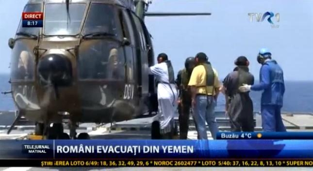 conform sursei citate, un alt grup de 4 persoane — trei cetățeni români și un membru de familie, cetățean yemenit — au fost evacuate în siguranță, pe cale terestră, din Taizz către Arabia Saudită și pe tot parcursul traseului s-au aflat în legătură permanentă cu Ambasada României la Abu Dhabi. “Ambasada României la Riad și Ambasada României la Khartoum îi vor prelua pe cetățenii români și le vor asigura asistența și protecția consulară necesară. MAE continuă eforturile de evacuare în siguranță a cetățenilor români aflați în Yemen și rămâne în legătură permanentă atât cu aceștia, cât și cu toate autoritățile competente din regiune. Sursa