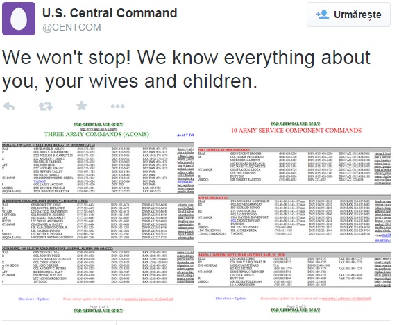 O grupare care se revendica din partea Statului Islamic a piratat luni conturile de YouTube si Twitter ale comandamentului in Orientul Mijlociu (Centcom), pe care au fost postat ceea ce hackerii pretind a fi documente secrete ale armatei americane, printre care si adrese personale ale ofiterilor.