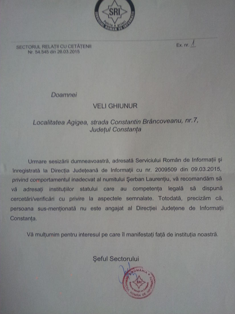 Veli Ghiunur se află în instanță pentru a-și recupera fostul loc de muncă și, între timp, s-a adresat Direcției Județene de Informații Constanța, pentru a afla dacă, într-adevăr, preotul Laurențiu Șerban este ofițer SRI. Publicăm răspunsul dat de reprezentanții SRI.