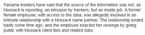 Femeia a fost angajată a firmei şi a avut o relaţie amoroasă cu unul dintre şefii firmei care a ajutat mii de personalităţi din toată lumea să-şi ascundă banii de fisc. Legătura s-a terminat prost, astfel că amanta dezamăgită a sustras cei trei terabiţi de informaţii compromiţătoare.