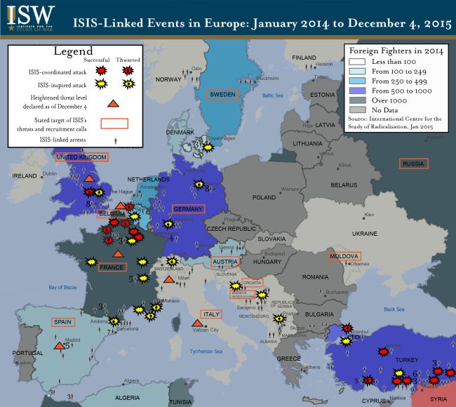 Institutul observa ca ISIS „executa o campanie de terorizare si polarizare a Europei” si ca gruparea „a inspirat, a oferit resurse in acest sens si a comis atacuri in Marea Britanie, Franta, Belgia, Olanda, Germania, Spania, Bosnia si Turcia inca din ianuarie 2014.”