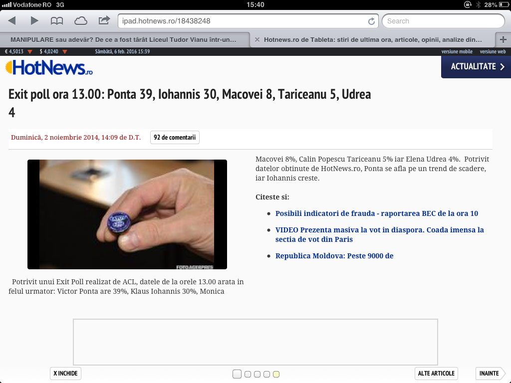 Ponta 40%, Iohannis 30%, Tariceanu 5%, Udrea 5%, Macovei 4%