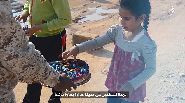 ISIS-BOMBOANEImagini halucinante apar într-un nou material de propagandă difuzat de către militanţii ISIS. Au filmat în timp ce împart bomboane la copii, dar şi la adulţi, pentru ceea ce ei numesc “sărbătorirea” masacrului din Paris. În acelaşi mod au “celebrat” şi atacul din Egipt, când au doborât o aeronavă rusă şi au făcut peste 200 de victime, informeaza reteauadestiri.ro.