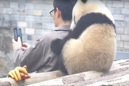 Un ursuleţ panda apare într-un filmuleţ alături de unul dintre ”taţii” lui adoptivi de la centrul de conservare din sud-estul ţarii în timp ce ţine capul lângă cel al îngrijitorului şi priveşte înainte suficient cât să îi permită acestuia să imortalizeze momentul.