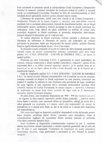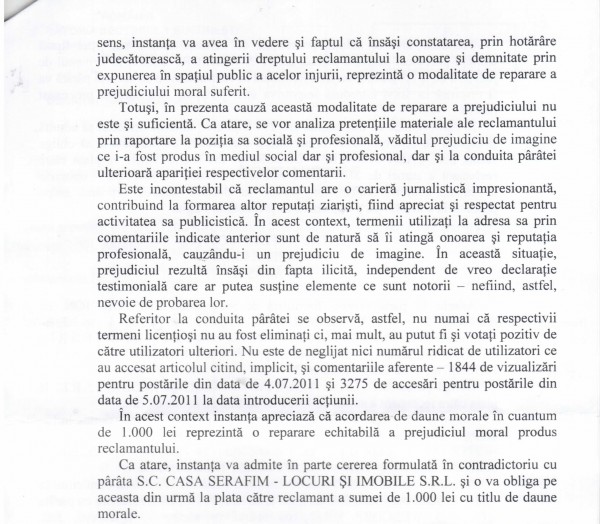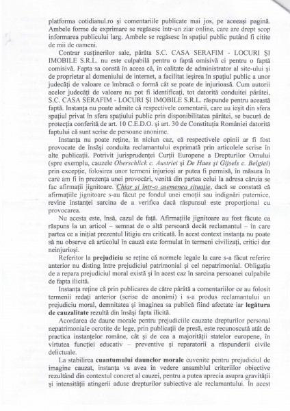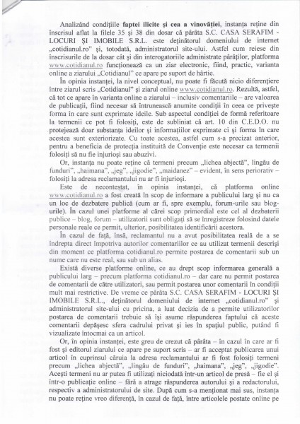 In acelasi timp, prin mentinerea in spatiul virtual a unor asemmenea comentarii, administratorii site-ului permit aducerea unei grave atingeri imaginii mele, imagine construita de-a lungul anilor, atat in componenta sa morala, cat si profesionala. Lasand sa se foloseasca acest site ca mijloc de aducere la cunostiinta publica a oricaror opinii, a comentariilor injurioase, abjecte, care sunt facute publice sub egida unei marci de renume, Cotidianul, paratii contribuie la influentarea in mod negativ a perceptiei cititorilor, care si-au format o anumita imagine despre mine, imagine careia ii sunt de acum asociate notiuni precum turnator, catastrofa, oportunist etc.