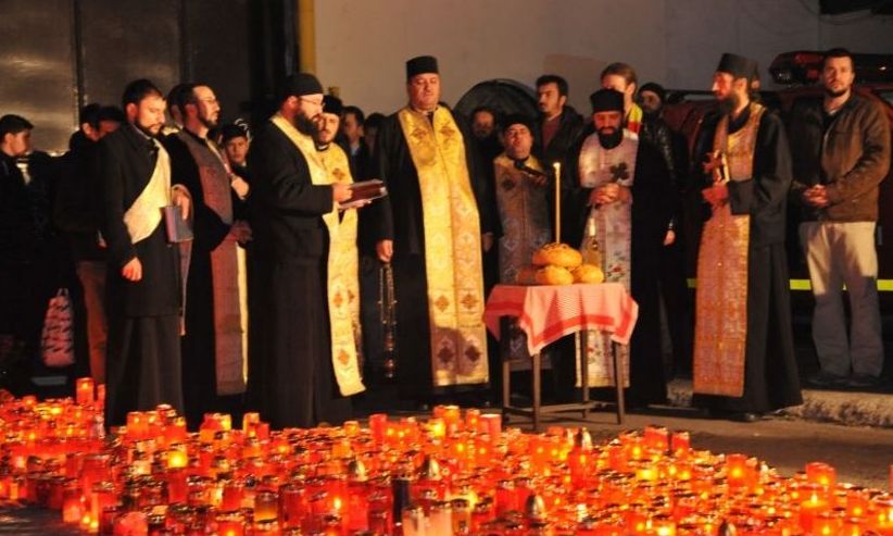 Un sobor de noua preoti, condus de Marius Cojocaru, paroh al Bisericii Sfantul Nicolae Brosteni, a ţinut marti seara, in fata clubului Colectiv, o slujba de pomenire pentru victimele incendiului de vineri seară.