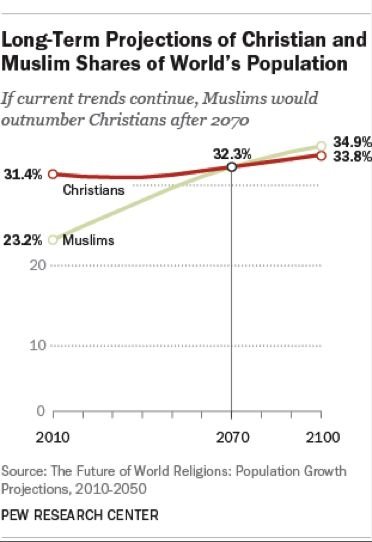 Este de asteptat ca populatia globala sa creasca la 9,3 miliarde pana in anul 2050, insa numarul de musulmani – o populatie mai fertila si relativ tanara – este de asteptat sa ajunga aproape egal cu numarul de crestini. Apoi, cam prin anul 2070, Islamul va fi cea mai mare religie din lume, depasind crestinismul.