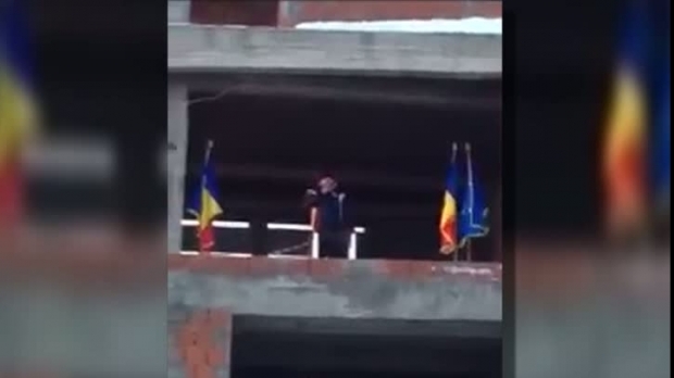 Edilul comunei Afumaţi şi-a repetat discursul pentru noaptea dintre ani de la geamul unei clădiri aflate în paragină.