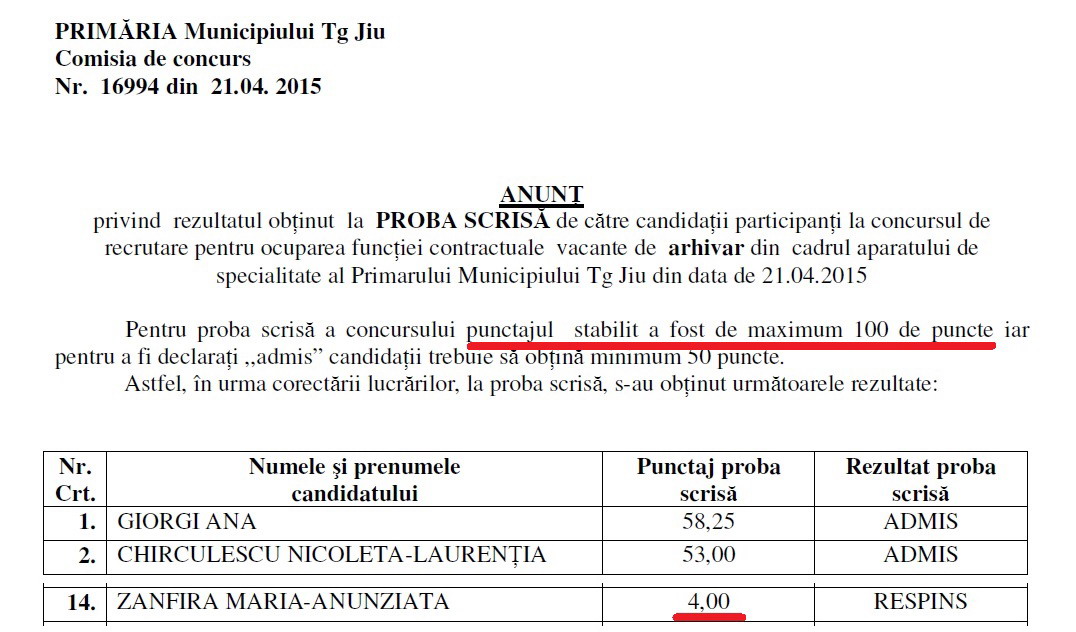 Dacă soțul ”duamnei” n-ar fi ofițer în Inspectoratul Județean de Poliție Gorj, s-ar declanșa imediat o anchetă penală, mai ales că, în urmă cu numai câteva luni, Zanfira Maria Anunziata a luat doar 4 puncte din 100 posibile, adică nota 1 și ceva, la un concurs similar organizat de Primăria Târgu Jiu.
