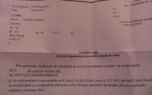 O femeie de 56 de ani, din Bârlad, asistent maternal pentru cei doi nepoţi ai ei, trăieşte spaima că va ajunge să fie îngropată în datorii după ce a primit somaţie de la Agenţia Judeţeană a Finanţelor Publice (AJFP) Vaslui prin care i se cere să declare veniturile încasate în 2014 din activităţi independente. Mariana Negru a primit anul trecut diferite sume de bani în scop umanitar de la persoane fizice şi juridice.