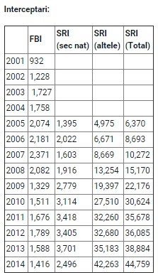 Concret, in 2014, SRI a facut 2.469 de interceptari pe securitate nationala la o populatie de 20 de milioane de locuitori (luam in calcul ca unii sunt plecati la lucru in strainatate), in timp ce FBI a facut 1.416 interceptari pe o lege similara la o populatie de 319 milioane. Evolutia comparata a numarului de interceptari se poate vedea in tabelul de mai jos.