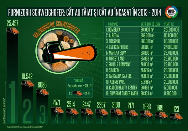 RISE Project a analizat primii douăsprezece furnizori de lemn ai Schweighofer, care, împreună, au livrat peste o treime din cantitatea totală a buștenilor cumpărați de compania austriacă în perioada 2013-2014. Adică, primii douăsprezece beneficiari ai banilor plătiți de Schweighofer, așa cum rezultă din miile de contracte de achiziții ale corporației declarate la Fisc. Cei 12 furnizori doboară copaci, în special în județele Alba, Bistrița, Harghita, Maramureș și Suceava, adică zonele cele mai afectate de tăierile masive de pădure.