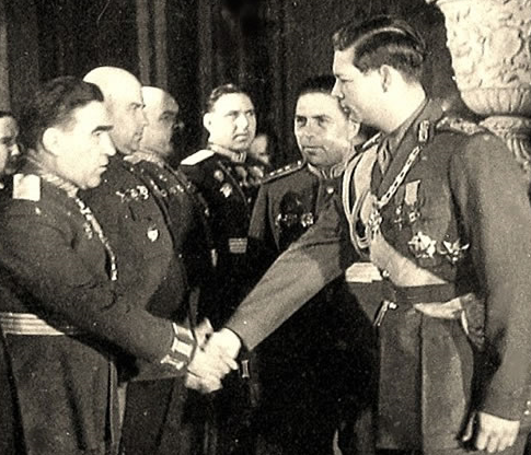 (Foto: De la stînga la dreapta: D. Gh. Gheorghiu-Dej, I.P.S. Patriarhul, mareşalul Tolbuhin, M.S. Regele, General de tancuri Susaikov, Gh. Tătărescu, d-na Kavtaradze, Dr. Petru Groza, d. Kaviaradze.)