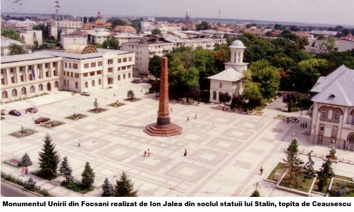 Piața centrală a Focșanilor are o istorie zbuciumată şi reprezintă poate cel mai bine modul în care s-au succedat la putere regimurile politice din România ultimului secol. Complexul arhitectural Piaţa Unirii din Focşani este situat pe vechiul hotar dintre Ţara Românească şi Moldova. În centru, este amplasat Obeliscul Unirii, operă a unui colectiv de artişti condus de sculptorul Ion Jalea, monument inaugurat pe 24 ianuarie 1976. Piaţa Unirii, aşa cum arată acum, este departe de ce era acum 50 de ani. În anii 70, conducerea administrativă a municipiului a decis reamenajarea pieţei, în stilul arhitectural specific comunist. Tot atunci s-a demolat Palatul Comunal, o clădire cu o arhitectură interbelică, dar şi strada istorică a oraşului. Atunci a fost ridicat şi Obeliscul, botezat “Morcovul” de catre focşăneni. Pentru că ansamblul s-a degradat în timp, începând cu anul 2008, perimetrul istoric al pieţei a fost din nou reamenajat, de această dată cu fonduri europene. Rezultatul este că în locul vechiului granit, intercalate cu marmură de Rușchița, a fost pus mult beton de proastă calitate, importat din China, iar reparațiile înghit an de an sume importante de la bugetul local. Parcul Unirii a fost “mutilat”, ca să nu mai amintim de construirea unor “dughene” din sticlă, fier şi beton în parc, spre nemulţumirea focşănenilor. Nimeni nu a răspuns, nici măcar la alegeri, pentru “betonizarea” Pieţei Unirii.
