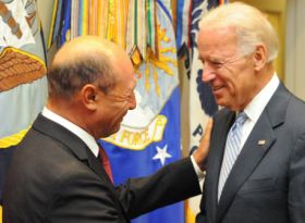 Joe Biden: Întâi de toate, permiteţi-mi ca în numele preşedintelui SUA şi al poporului american să-mi exprim recunoştinţa faţă de România pentru că ne-a permis să folosim baza aeriană Mihail Kogălniceanu (MK) drept centru logistic de tranzit pentru personalul şi echipamentul transportat din şi spre Afganistan, precum şi pentru că a salutat amplasarea elementelor sistemului de apărare antirachetă al SUA ca parte a Abordării Europene Adaptive în Etape ca parte a apărării antirachetă a NATO.