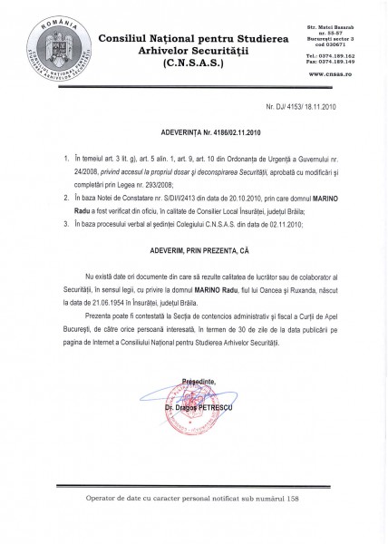 Cererea de verificare a lui Constantin Marino a fost facuta de Sorin Iliesiu, in februarie 2008. Magistratul este seful Sectiei I Penale a Tribunalului Bucuresti. Punctul 4 din Adeverinta nr 645/05.06. 2008 arata ca “in baza Notei de Constatare nr. S/DI/I/793 din data de 02.06.2008, intocmita de catre Directia de specialitate, din cadrul CNSAS in care se precizeaza urmatoarele: conform raspunsului SRI, domnul Constantin Marino Marin figureaza cu Dosar Fond Retea nr. 5041/Ialomita, distrus in 1982″, iar in bazele de date ale Directiei nu s-a identificat material probator pe numele domniei sale.