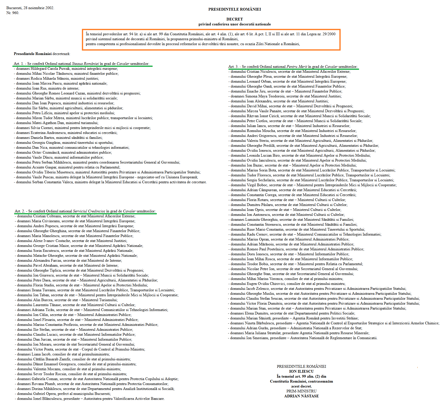 Jurnalistul Robert Turcescu a scris recent pe blogul său despre Cancelaria Ordinelor și mai multe persoane care au fost decorate. Pe 28 noiembrie 2002, scria Turcescu potrivit Monitorului Oficial P A R T E A I, anul XIV – Nr. 865 de vineri, 29 noiembrie 2002, presedintele Romaniei de la acea vreme, domnul Ion Iliescu, i-a acordat domnului Victor Ponta Ordinul NationalServiciul Credincios în grad de Cavaler. Decretul a fost contrasemnat de primul-ministru de atunci, domnul Adrian Nastase. Mai jos, lista tuturor celor care in noiembrie 2002 au primit aceasta distinctie, dar si alte decoratii, unele chiar mai importante. Va recomand o lectura atenta, numele sint sonore, recomanda Robert Turcescu.
