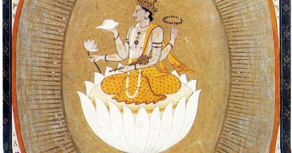 În conformitate cu mitul hindus, universul este creat şi distrus perpetuu. Înainte de fiecare nou ciclu, o floare de lotus creşte din ombilicul lui Vishnu, iar din ea apare însuşi zeul, în întruparea sa ca Brahma creatorul. Brahma sparge oul, deschizând astfel un nou ciclu al creaţiei.
