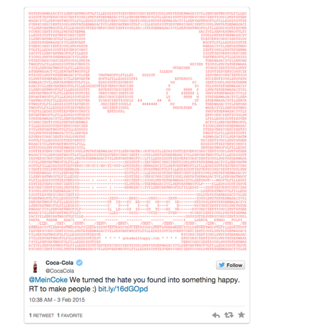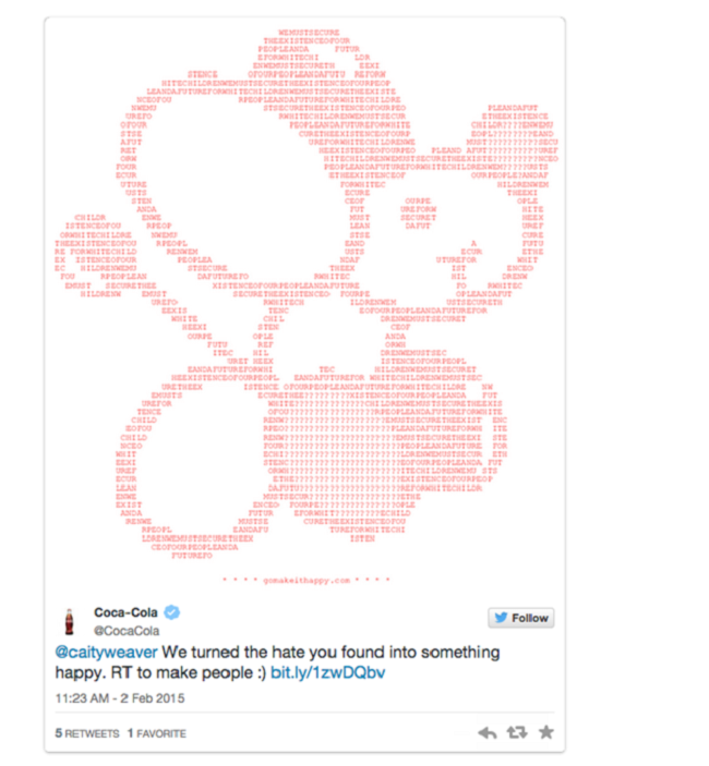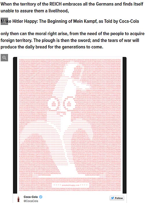 Coca-Cola a fost nevoită să retragă o campanie publicitară de pe platforma online Twitter după ce o contra-campanie demarată de site-ul Gawker.com a păcălit algoritmul automat folosit de compania de băuturi răcoritoare să publice pasaje mari din introducerea cărţii „Mein Kampf” a lui Adolf Hitler.