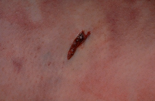 Acelasi pattern si aici, dar in tesut moale: gaura de iesire e mica si cu putina sangerare.